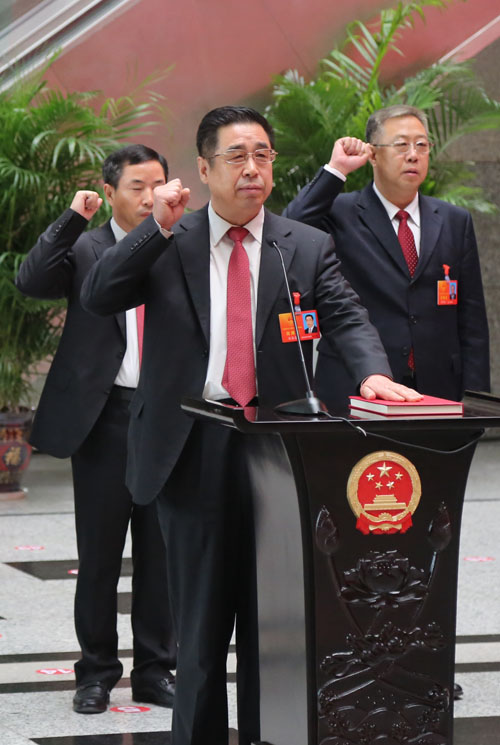 当选的市人大常委会主任、副主任、秘书长,市政府市长、副市长,市法院院长,市十四届人大常委会委员,市十四届人大各专门委员会组成人员等先后分批走到指定位置,领誓人左手抚按《宪法》、右手举拳,跟誓人右手举拳,齐声宣读了誓词。